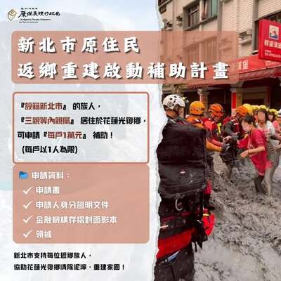 1.凡設籍新北市的族人,若三親等內親屬 居住於花蓮光復鄉,可申請每戶1萬元 補助(每戶以1人為限)。