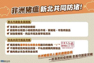 一、.接獲出現疑似非洲豬瘟案例後,新北市立即成立跨局處稽查小組,聯合稽查肉市加工廠、超市、餐飲業、屠宰場、豬場,也訪視107家養豬場,落實消毒、強化防疫。