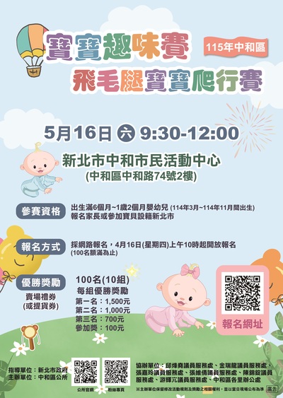 新北市中和區公所將於115年5月16日(星期六)於中和市民活動中心辦理「115年中和寶寶趣味賽-飛毛腿寶寶爬行賽」活動,詳情請參閱附件電子檔。