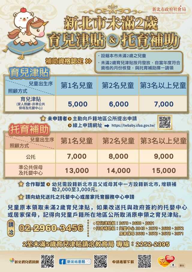 「育有未滿二歲兒童育兒津貼及托育補助」宣導單