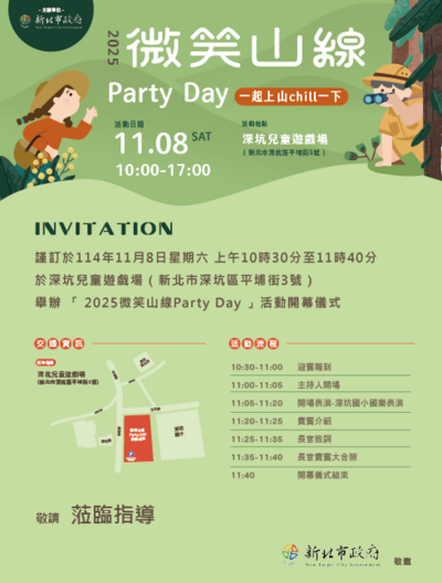 本案活動將於114年11月8日(六)上午10時至17時於深坑兒童遊戲公園及深坑廳辦理微笑山線Party Day活動,歡迎社會大眾共襄盛舉,詳情請參閱活動電子檔。